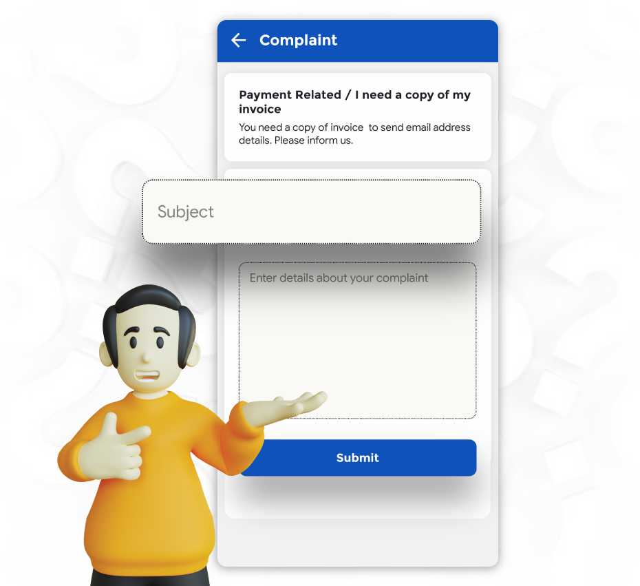 Complaint/Support module provides a user-friendly interface through which users can submit complaints, queries, or requests for support. It provides users with a way to seek help, report issues, ask questions, or provide feedback related to the application or the services it offers.